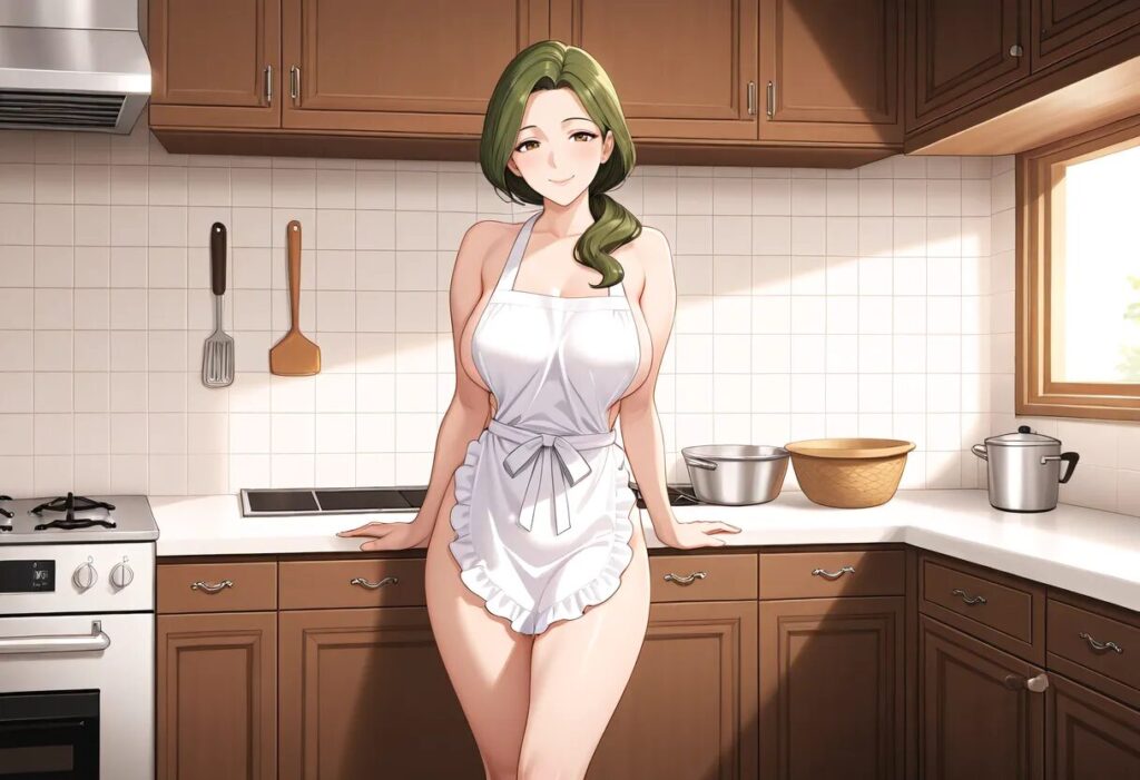 1girl, milf, cooking, naked apron, kitchen, standing doggystyle, best quality