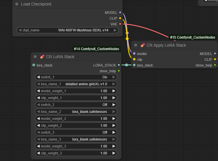 そんな悩みを解決してくれるのが「CR Apply LoRA Stack」ノードです。