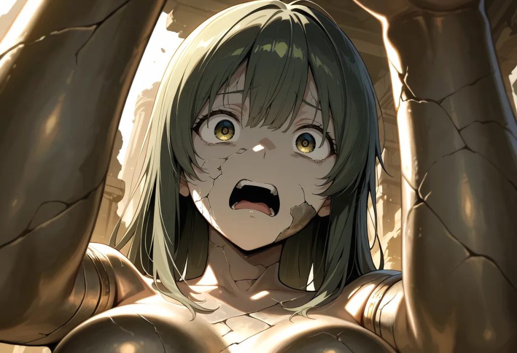 ダンジョンで見つかった石化した女の子。ヒビ割れた姿を見て、男たちは性のはけ口とする……