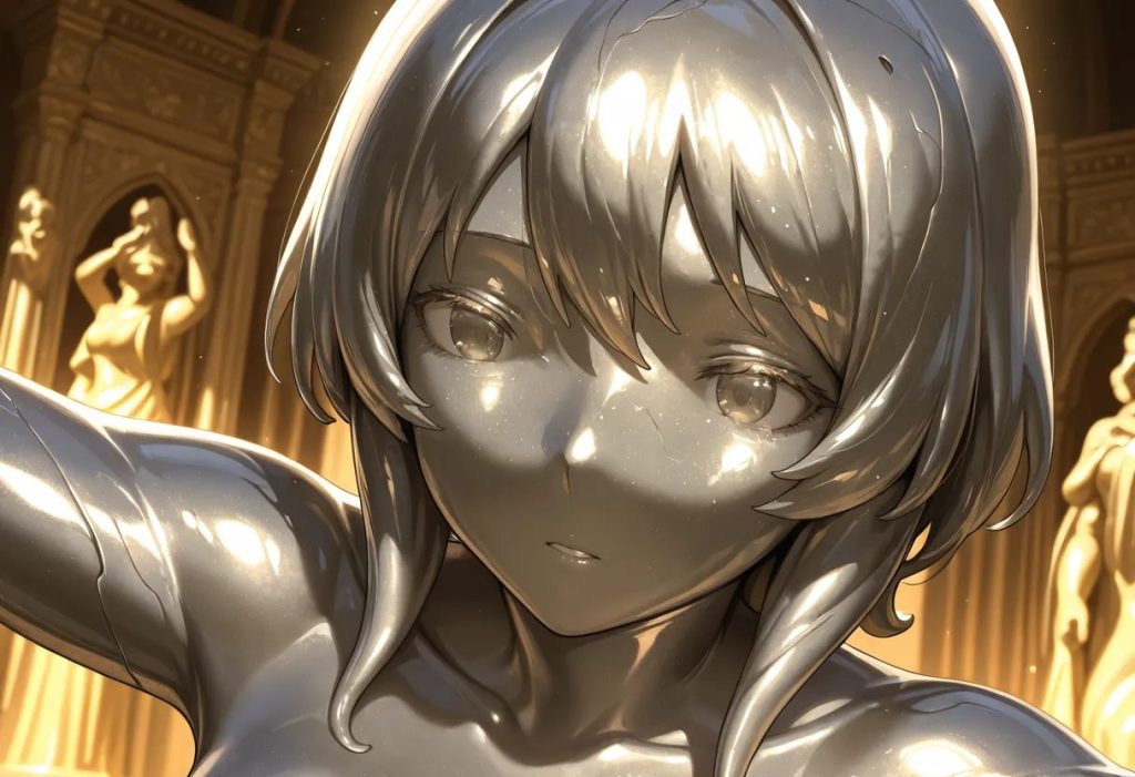 shinyで光り輝く、完全にstatueになってしまった女の子。踊るポーズのまま美しく保存されました。statueとpetrificationを併用しないとただの彫像がポツン。