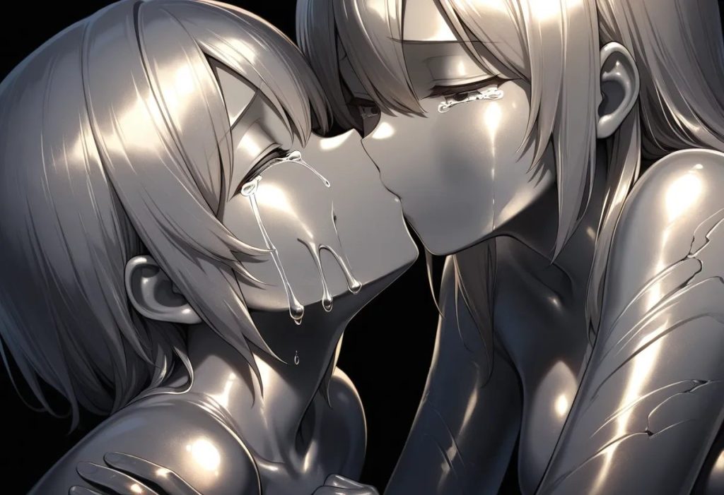 唇を合わせたまま、互いの温もりが冷たく変わっていく。頬を伝う涙が石化して光を反射し、切ないほど美しいコントラストに。二人の指が触れ合ったまま動かない停止の愛がテーマ。