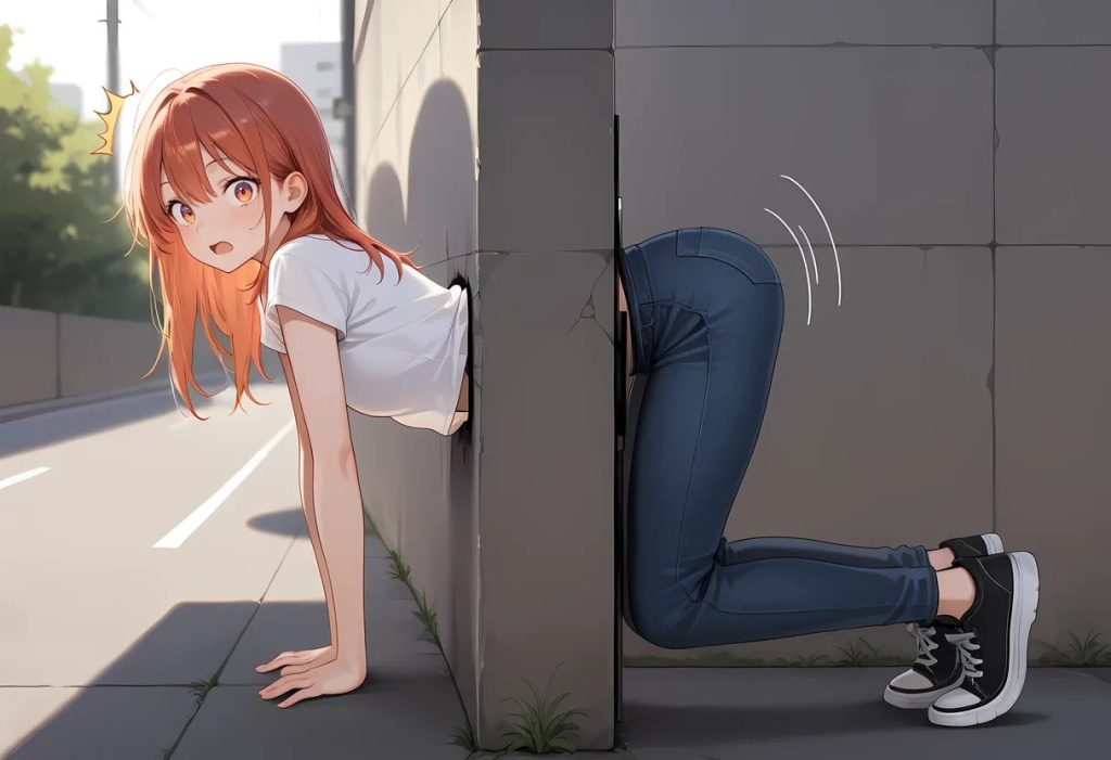 1girl, looking at viewer, surprised, casual, through wall, from side, stuck, full body, outdoor, best quality