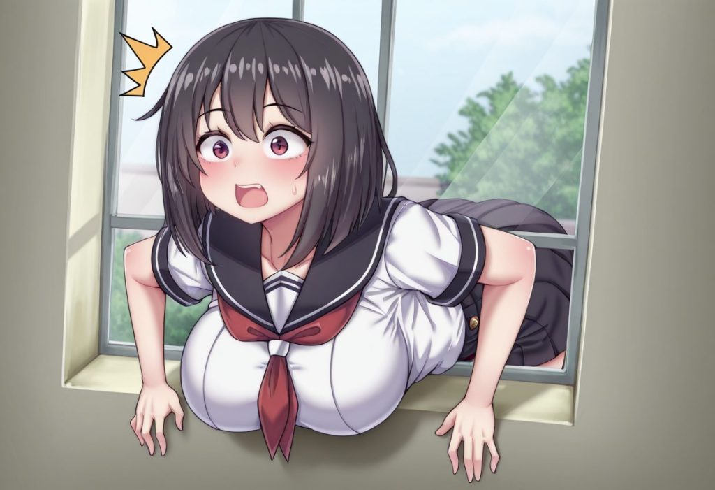 1girl, large breasts, school uniform, surprised, siw, stuck in window, stuck