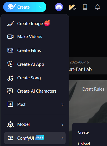 CreateのプルダウンメニューにあるComfyUI>Createをクリックします。