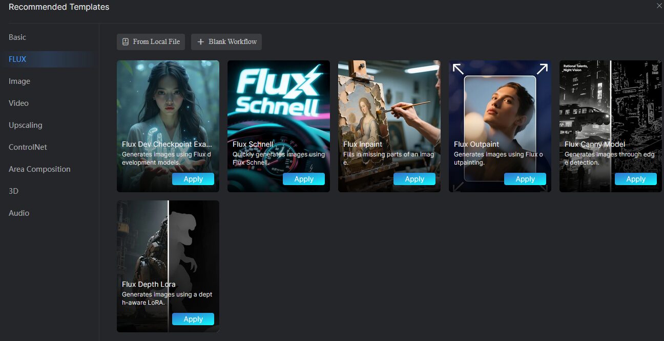 するとワークフローのテンプレート画面に移行します。使いたいワークフローがあれば、From Local Fileへ。なければBlank Workflowで1から作成するか、テンプレートで利用開始。